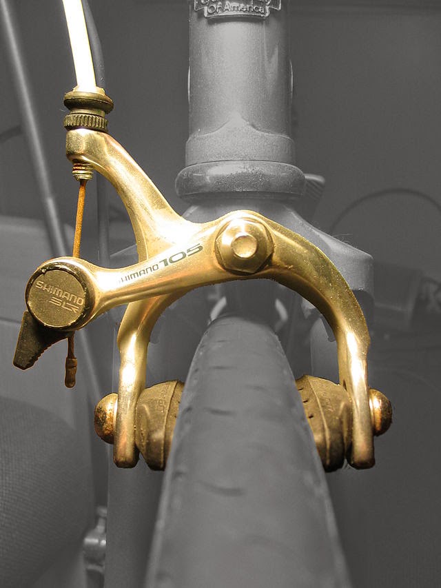Moving on... You have attached the lever, clamped the brake cable nipple and now you are standing there with a brake cable in your hand. Start directing the cable along the top tube for the rear brake and directly to the fork for the front brake. If you haven't attached the brake to the front fork or rear seatstay (the bar diagonally under your seat) before I told you to do so, do it now.
